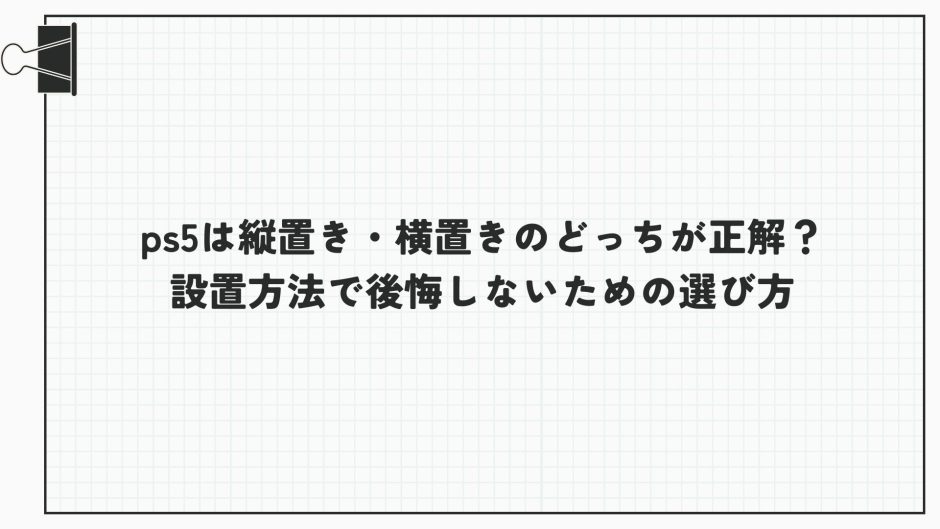 PS5を購入したものの「縦置きと横置き、どっちがいいの?」と迷う方は少なくありません。見た目の好みだけで決めてしまいがちですが、実は排熱効率や安定性、設置スペースなど、長く快適に使うために無視できない要素があります。本記事ではソニー公式の見解からユーザーの実測データ、さらに生活環境ごとのメリット・デメリットまで徹底比較します。